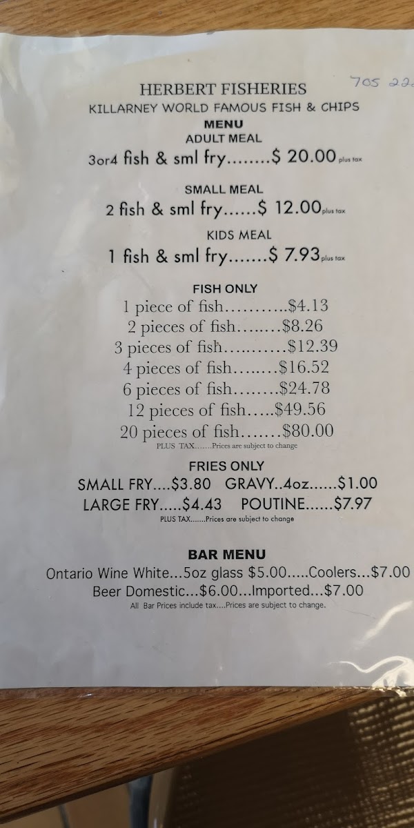 At Herbert Fisheries, the menu is simple yet enticing, with the spotlight shining brightly on their fish and chip offerings. The Adult Fish and Chip Meal, featuring 3 or 4 pieces of perfectly battered pickerel, comes paired with crispy fries, creamy coleslaw, and two tartar sauce packets—making it a delectable feast for only CA$27.18. For those looking for a smaller portion, the Small Fish and Chip Meal offers 2 pieces of fish for CA$16.50, ensuring there's something for everyone. Each piece of fish is carefully fried to a golden brown, delighting your taste buds with its flaky interior and light, crispy exterior.